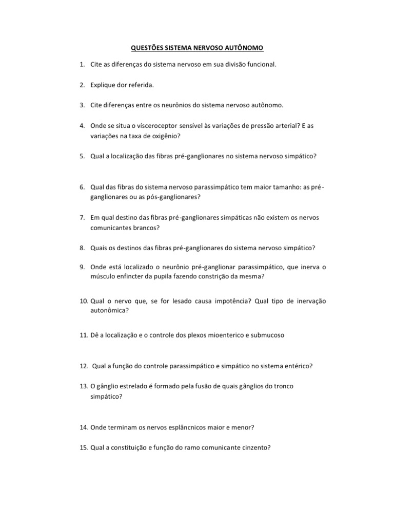 C sistema nervoso autônomo. Quiz com exercícios sobre o sistema nervoso para aqueles que desejam estudar o assunto. 1 1 pt s Complete.