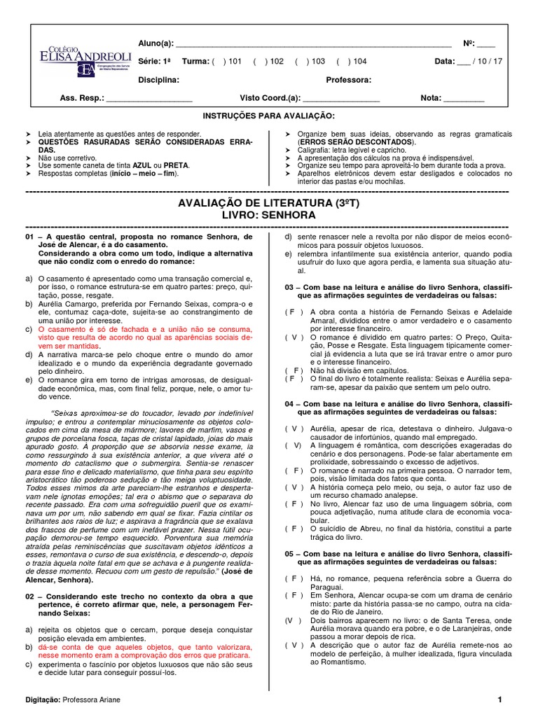 Gabarito Prova Do Livro Senhora A3ºt Pdf Romantismo Amor