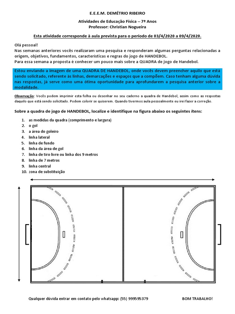 Atividades Educacao Fisica 7º Anos Quadra Handebol Pdf