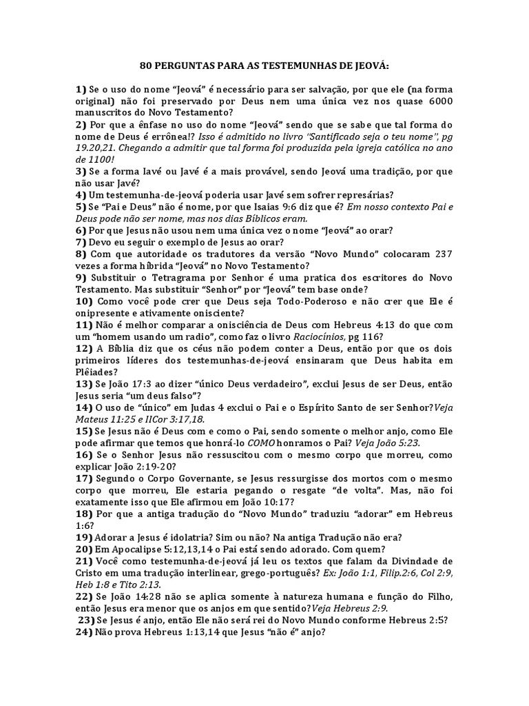80 Perguntas Para As Testemunhas De Jeova Pdf Yhwh Biblia